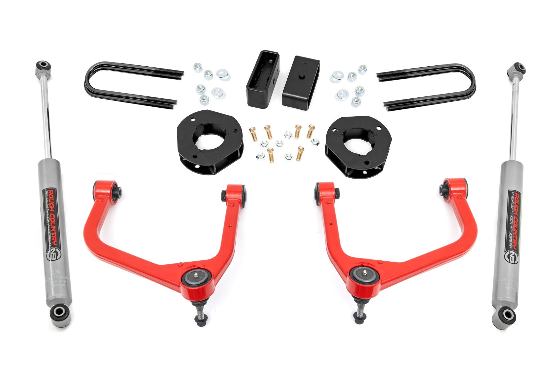 Lifts and levels the front of the vehicle with the rear. Front Lift: 3.5in | Rear Lift: 2.5in Increased ground clearance. Includes forged aluminum control arms. Control arms include POM ball joints for a greater range of motion and easier installation. Ball joints are pre-installed to ease installation. Fabricated lift blocks are stronger and offer a longer lifespan than cast blocks. Optional N3 Loaded Struts Includes pre-loaded coil. Maintains smooth