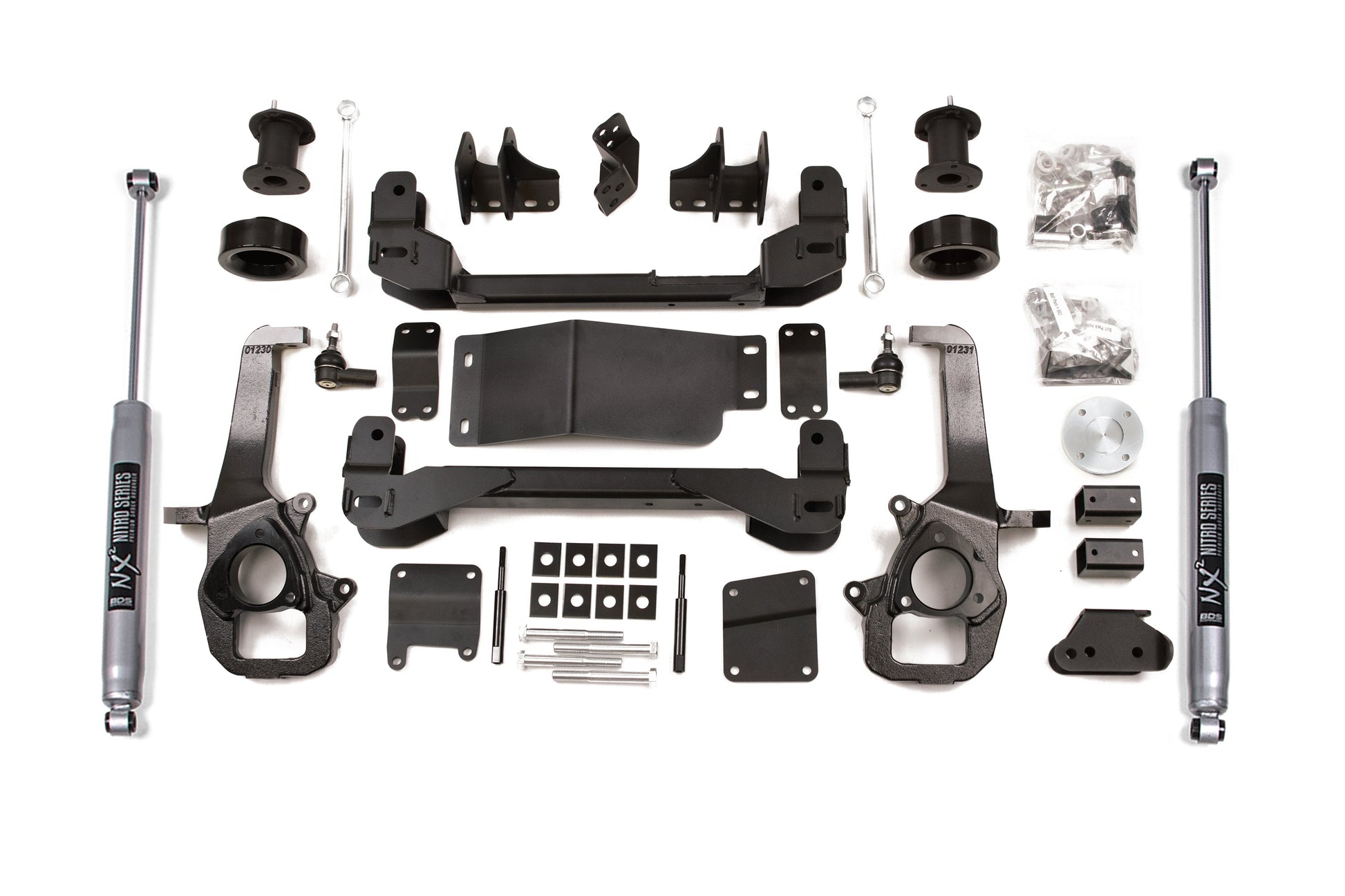 In the rear this kit utilizes progressive rate Pro-Ride coil springs, rear upper control arm relocation brackets to correct pinion angle, track bar relocation bracket to correct axle positioning, bump stop extensions, and sway bar links. The rear of these kits are rounded out with your choice of specially tuned NX2 nitro series gas shocks or FOX 2.0 IFP performance series gas shocks to offer improved damper performance.