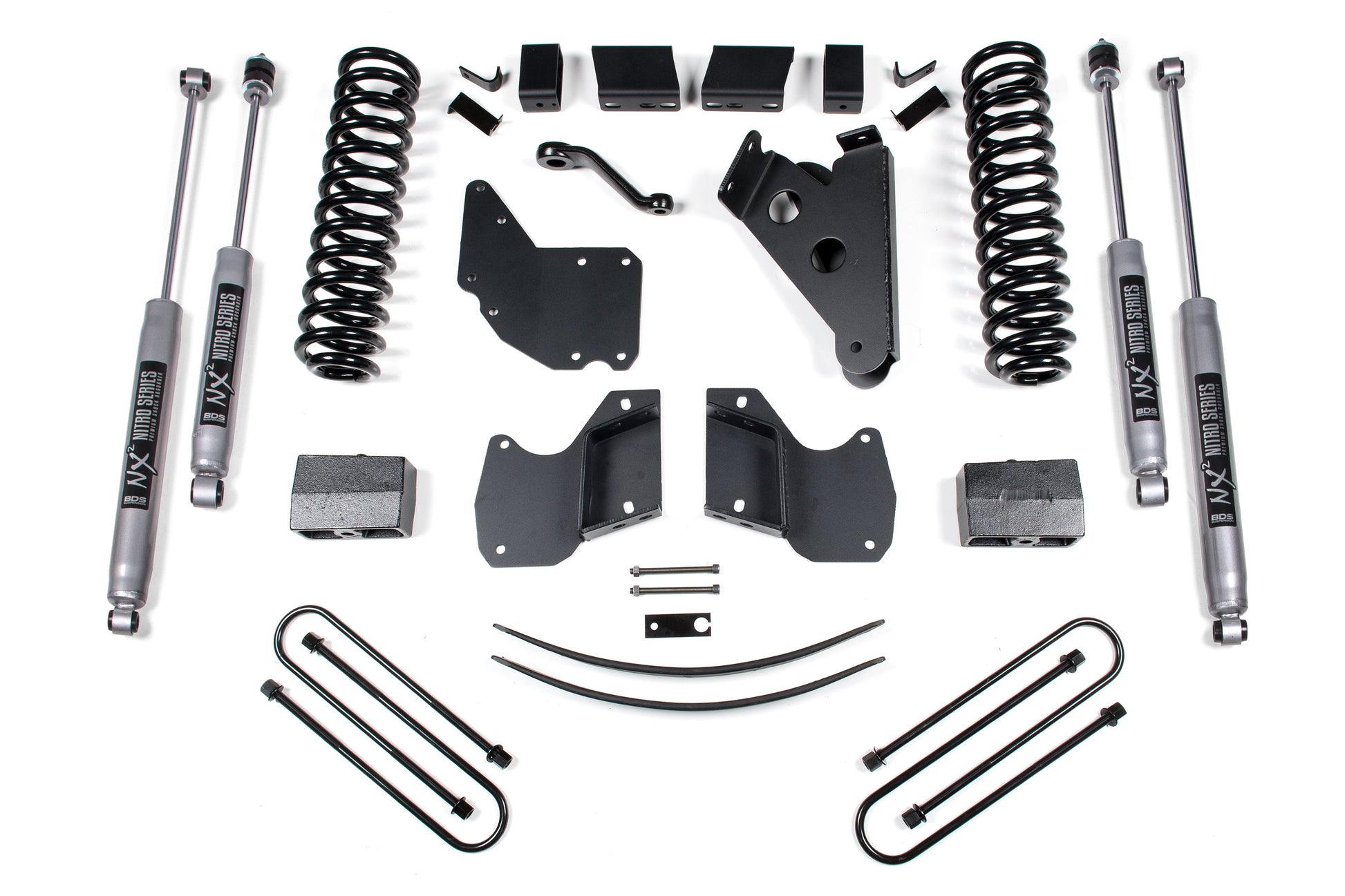 In the rear the base kit utilizes a high-strength lift block, longer u-bolts and a matching set of NX2 Nitro shocks.