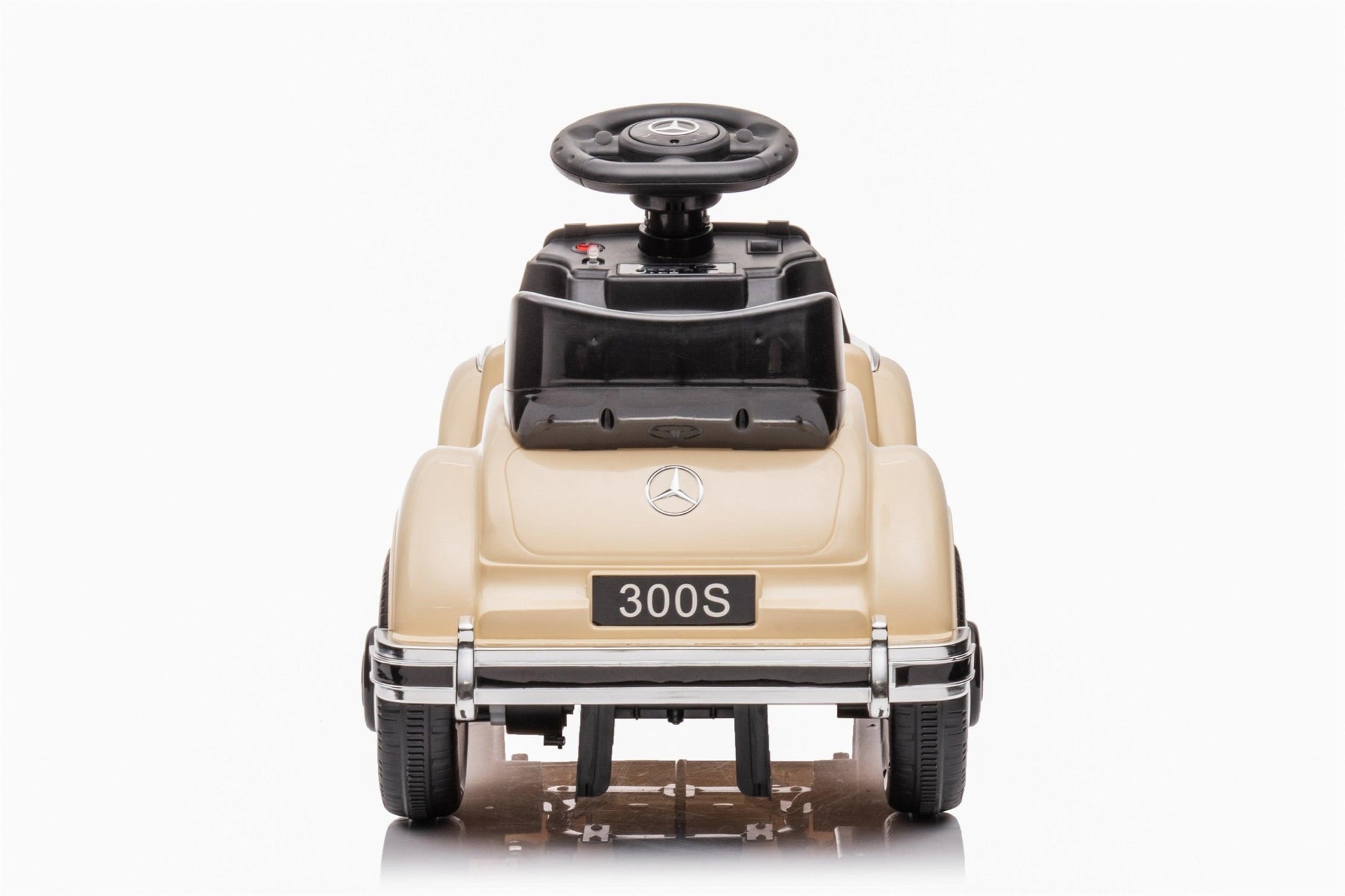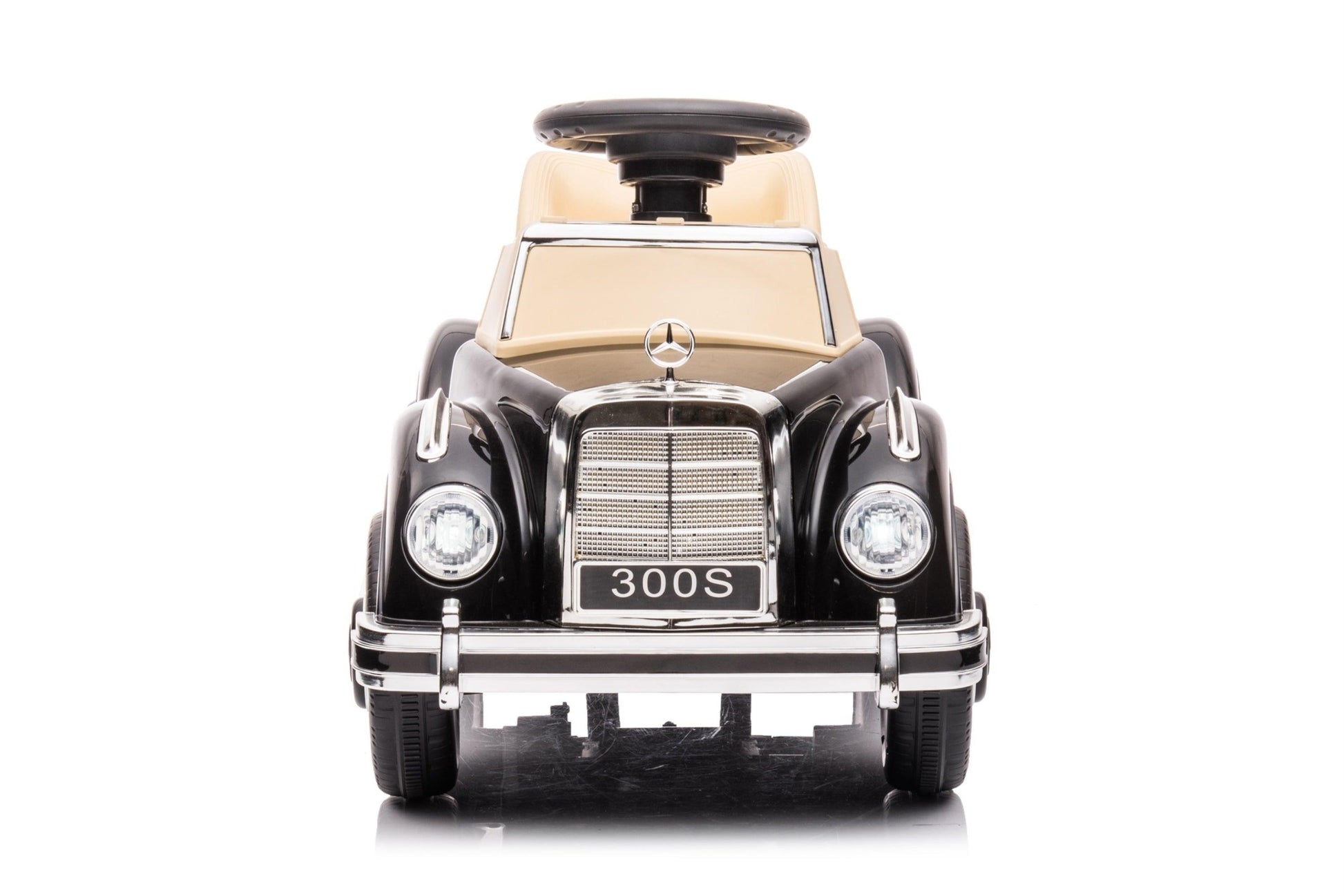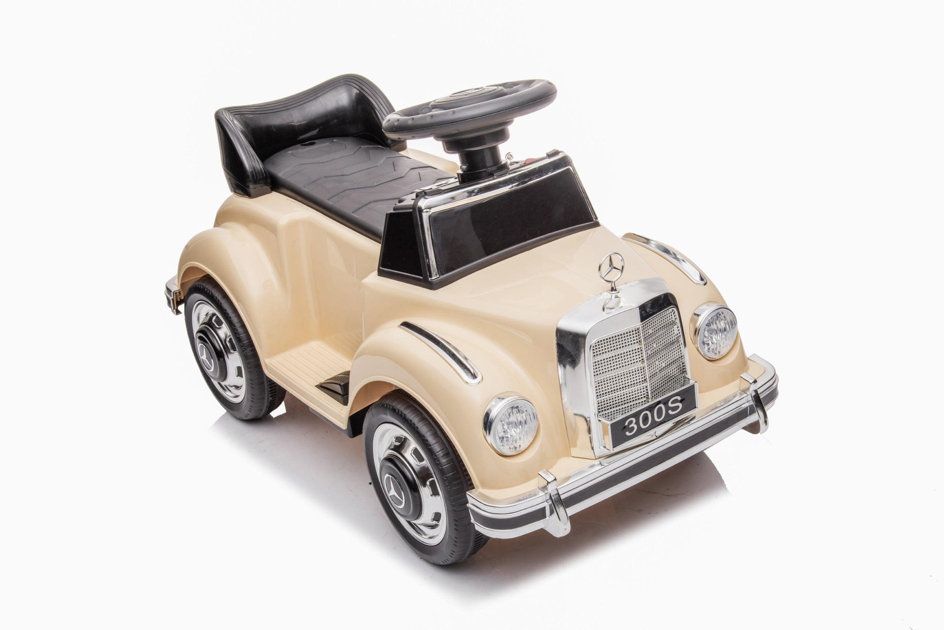 - Vintage Style: A mini ride-on car styled after the classic Mercedes 300S, complete with a sleek black or beige finish and front LED lights for a luxurious look.