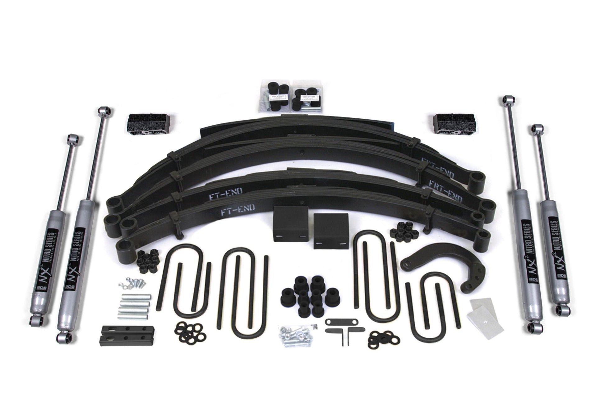 Up front the lift kit includes Glide-Ride leaf springs, 4" steering arm and 3" steering block for steering correction, brake line brackets, sway bar drop brackets and precision tuned NX2 nitrogen charged shocks. In the rear this kit utilizes a set of Glide-Ride leaf springs for the ultimate performance on and off road, new u-bolts and a matching set of NX2 Nitro shocks.