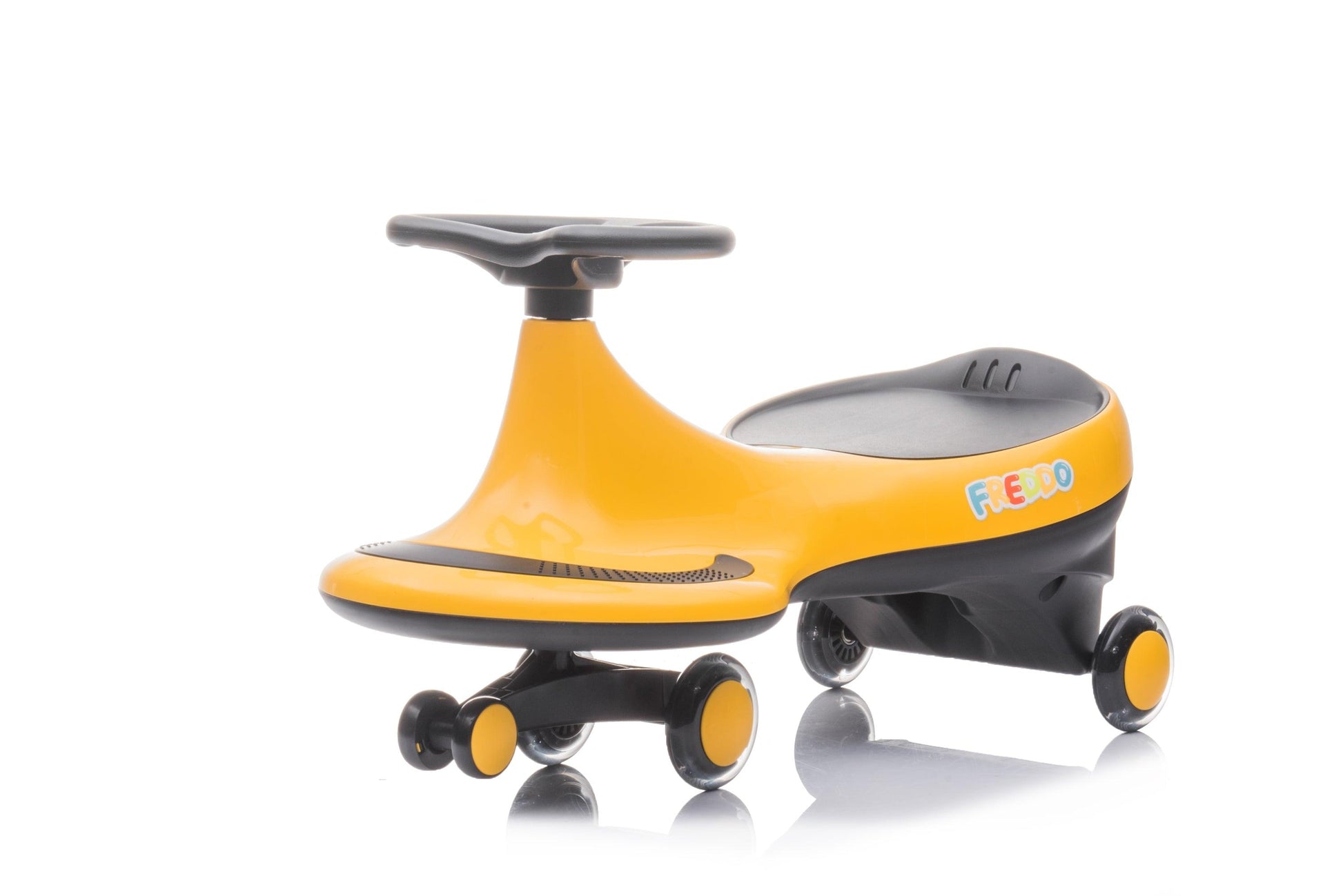 No batteries, gears or pedals. Freddo Swing Car is kid friendly and kid approved. A sleek design with a safety seat by Freddo is great for children 3 years and up, and it’s easy to use – just prop your feet up on the footrests and turn the steering wheel to get moving. The maximum speed is 10 km/h and can be used both indoors and outdoors. It holds up to 110 lbs. and meets US, Canadian and European quality and safety standards.