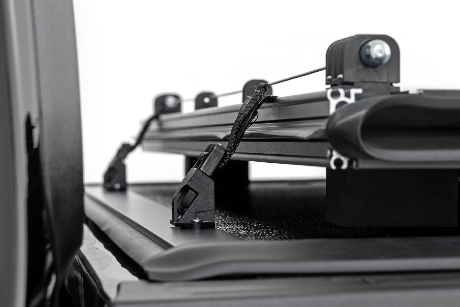Sleek Low-Profile Look: Flush design with a stylish matte black frame and lightweight, durable aluminum panels.\ Convenient Tri-Fold Access: Fold the cover quickly for fast and easy access to your cargo.\ Durable Construction: Corrosion-resistant black powder-coated aluminum frame stands up to the elements.\ Secure Mounting System: Features a robust track and rail setup with included drain tubes for water management.\ 2/3 Open Position Ready: Nylon safety straps keep the cover secure while driving partially open.\ Flexible Driving Options: Drive confidently with the cover either fully closed or secured in the 2/3 open position.\ Automatic Latching: Auto-latching mechanism locks the cover down securely every time.\ Effortless Access: Single cable pull system allows quick and easy latch release from either side.\ No-Drill Installation: Simple, tool-included install with no drilling required for mounting or removal.\ Extra Safety: Nylon safety straps included for added security during transit.\ Backed by Confidence: Includes a 5-Year Warranty for peace of mind.