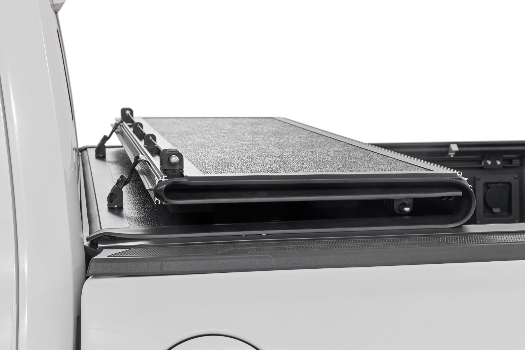 Flush, low-profile design with stylish matte black finish frame and aluminum panels. Tri-Fold Design allows quick access to cargo. Corrosion resistant black powder coated aluminum frame. Secure track and rail mounting system with drain tubes included. Nylon straps secure the cover in the 2/3 open position. Drive with the cover in the 2/3 open or closed position. Auto latching design secures on closure. Single cable pull for easy latch release and access. No drill easy install and removal - all tools included. Nylon safety straps included. 5 Year Warranty.Manufacturer Notes: